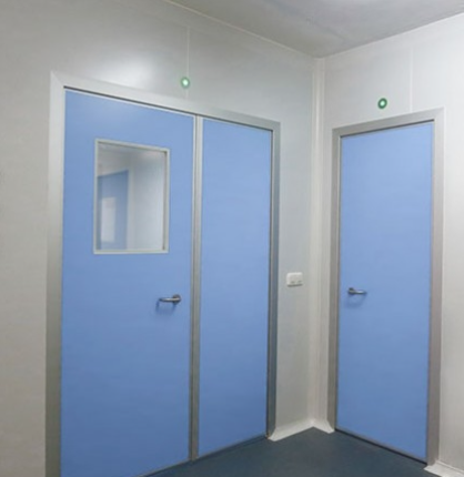 Puerta para áreas limpias con el mismo sistema de construcción de las paredes de panelería sanitaria. Incluye brazo deslizante y cierrapuertas para aplicaciones farmacéuticas, de tipo batiente o deslizante, con o sin visor, y preparada para incluir sistema de interbloqueo para esclusas.